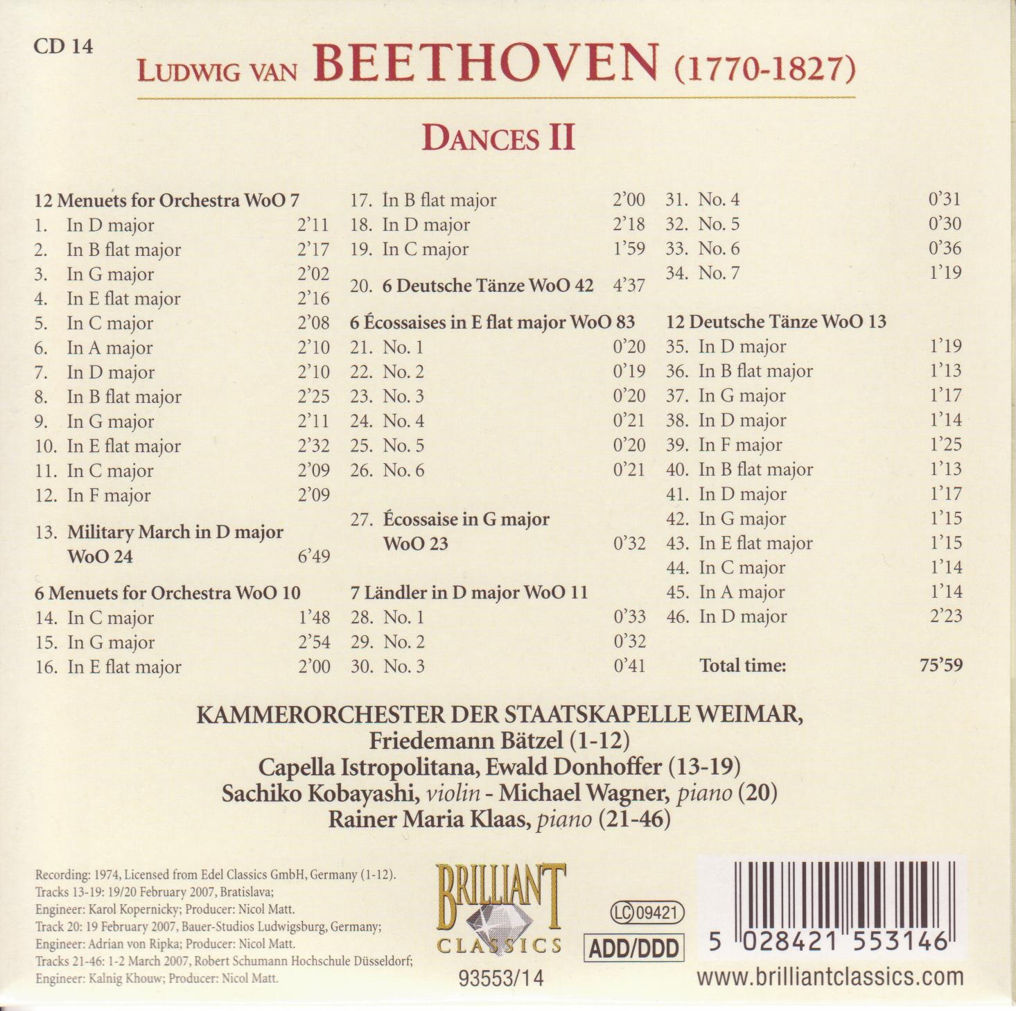 | - | 46 - 12 Deutsche Tanze, WoO13 - In D major (Rainer Maria Klaas).flac | 10081476 | | Complete Works CD 014 - Dances II | 46 | Ludwig van Beethoven | 12 Deutsche Tanze, WoO13 - In D major (Rainer Maria Klaas) | 1974 | 143.986667 | 560 | | flac | flac | | flac | 2024-05-26 16:54:17 |