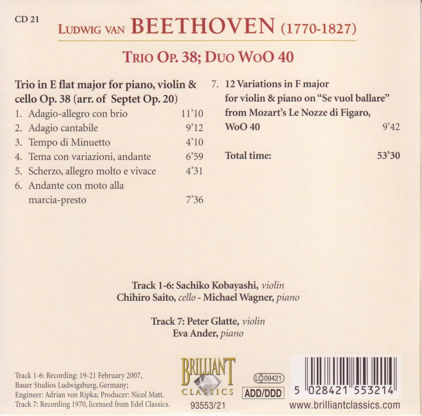 | - | 01 - Trio in E flat major for piano, violin & cello, Op. 38 - Adagio-allegro con brio.flac | 47576760 | | Complete Works CD 021 - Trio Op.28; Duo WoO40 | 1 | Ludwig van Beethoven | Trio in E flat major for piano, violin & cello, Op. 38 - Adagio-allegro con brio | 1970 | 670.12 | 567 | | flac | flac | | flac | 2024-05-26 16:50:49 |