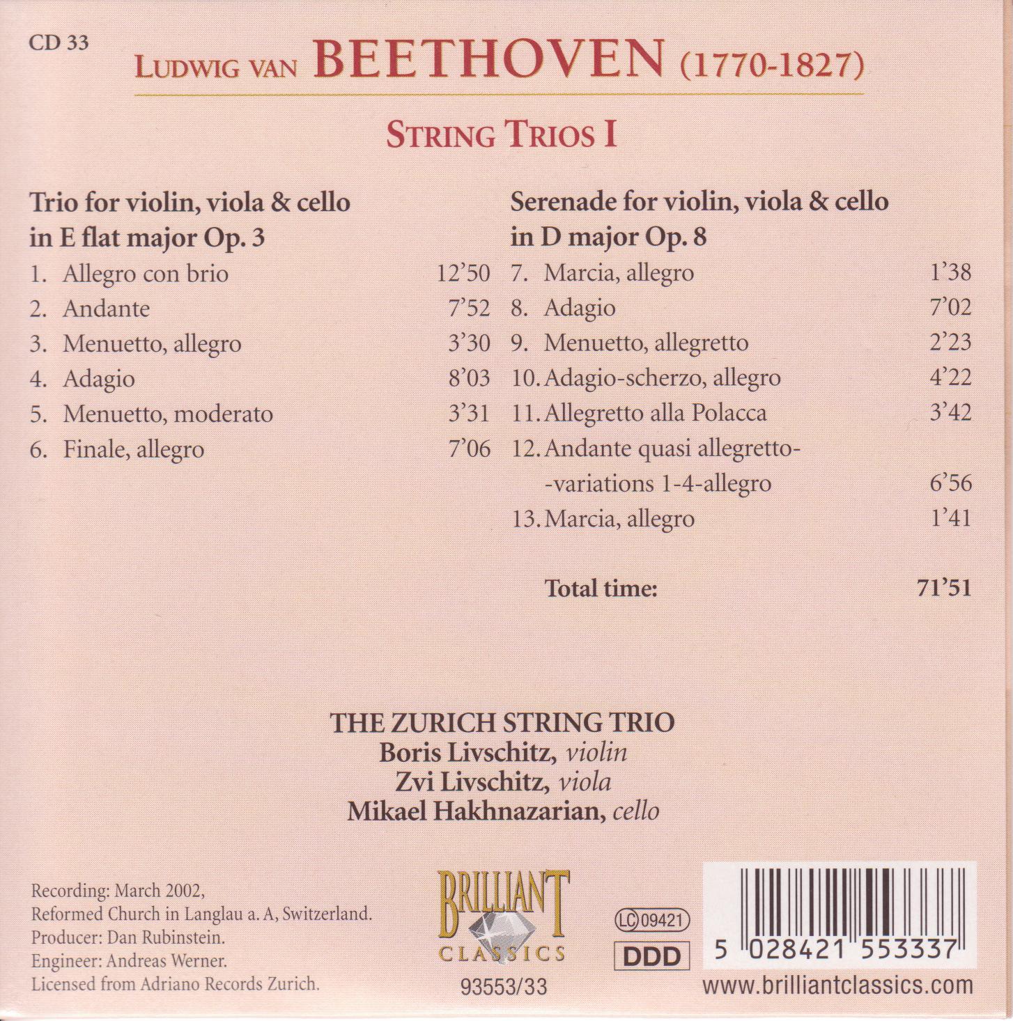 | - | 08 - Serenade for violin, viola & ncello in D major, Op. 8 - Adagio (Zurich String Trio).flac | 34555860 | | Complete Works CD 033 - String Trios I | 8 | Ludwig van Beethoven | Serenade for violin, viola & ncello in D major, Op. 8 - Adagio (Zurich String Trio) | 2002 | 422.4 | 654 | | flac | flac | | flac | 2024-05-26 16:45:53 |