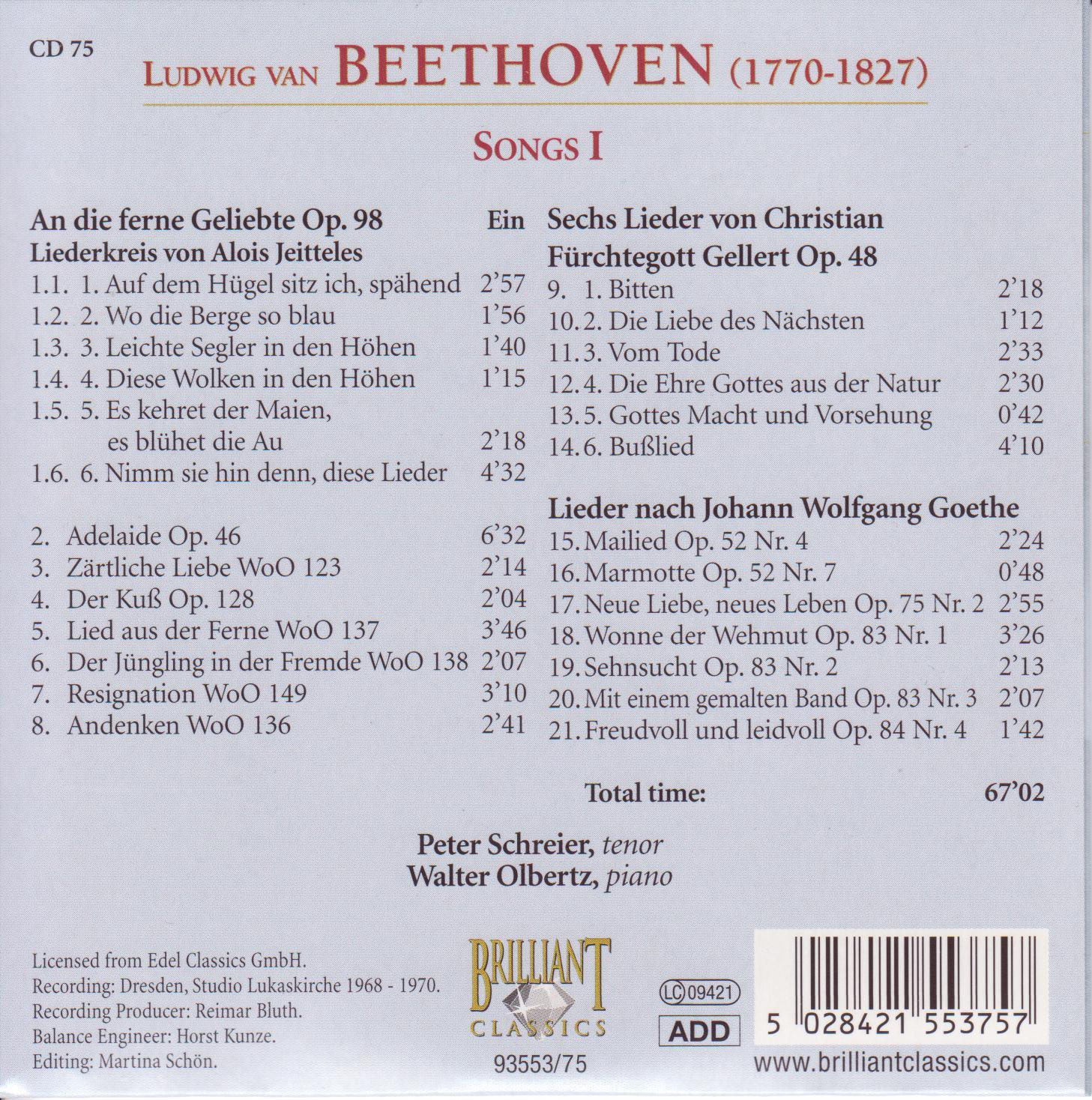 | - | 17 - Lieder nach Johann Wolfgang Goethe-=Neue Liebe,neues Leben= [Op.75,No.2].flac | 13345908 | | Complete Works CD 075 - Songs I | 17 | Ludwig van Beethoven | Lieder nach Johann Wolfgang Goethe-=Neue Liebe,neues Leben= [Op.75,No.2] | 1970 | 176.466667 | 605 | | flac | flac | | flac | 2024-05-26 16:24:51 |